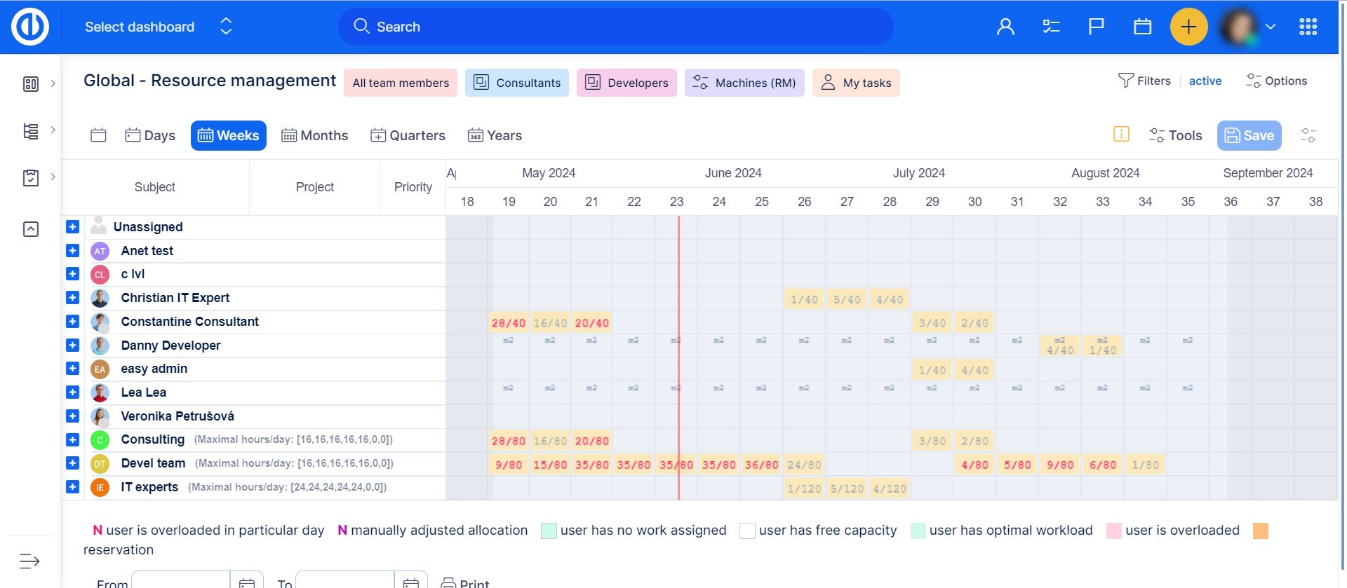 Hour limit per day: User daily working hours for allocations are limited by this value. Leave blank to use the default value. When working with resource allocation summary on week/month view, the colors indicating user's workload in the respective period take into account his current allocation time capacity. For example, if user A has capacity 40 hours a week, user B can work 30 hours a week while user C only 20 hours a week, then a weekly workload with estimated time 25 hours will color yellow for user A (user has free capacity - less than 70% workload), green for user B (user has optimal workload - more than 70% workload) and red for user C (user is overloaded - equal or more than 100% workload).