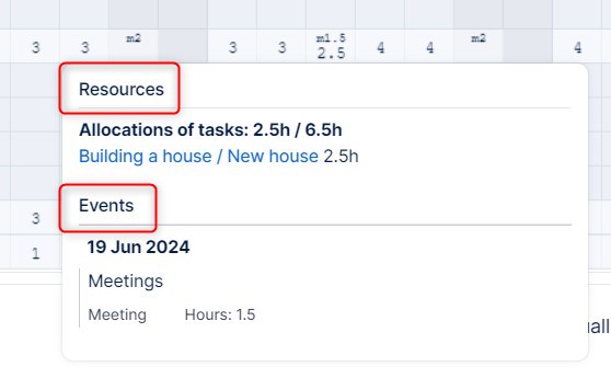 By clicking on a cell including an event, a small information tooltip appears showing the summary of the events in the selected period. The tooltip works on a daily, weekly and monthly basis as well. If there is a continuous event (vacation, business trip), the event is shown counted in the tooltip. A similar tooltip appears when you are on weekly/monthly view and click on any time allocation box on the timeline. This tooltip shows you the allocations of non-visible issues (tasks) which represent the total sum of hours for this particular week or month.