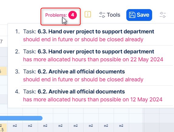 The Problems button can be found among the main controls at the top right. The button is complemented with a number that represents the amount of problems identified as illustrated below. Clicking on the button expands the list of the problems including the names of affected tasks and short explanations. These list items are links so you can click on any and that will highlight the respective task on the timeline. Clicking again on the button collapses the list.