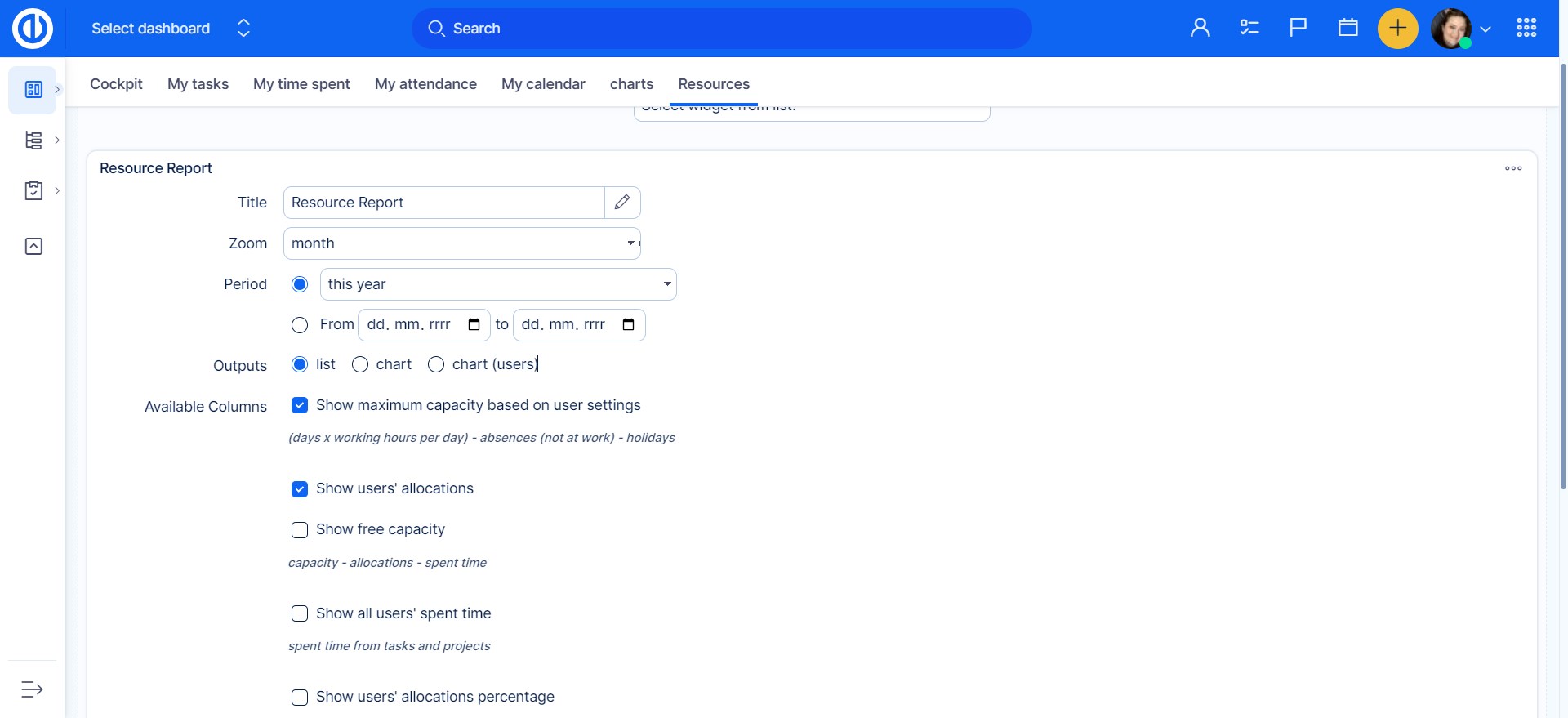 A new page widget called Resource Report (under the section Users) is available on any Dashboard such as My Dashboard or Project dashboard. It is a complement of Resource Management plugin and brings: