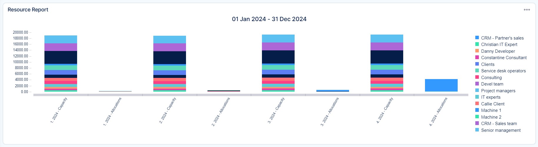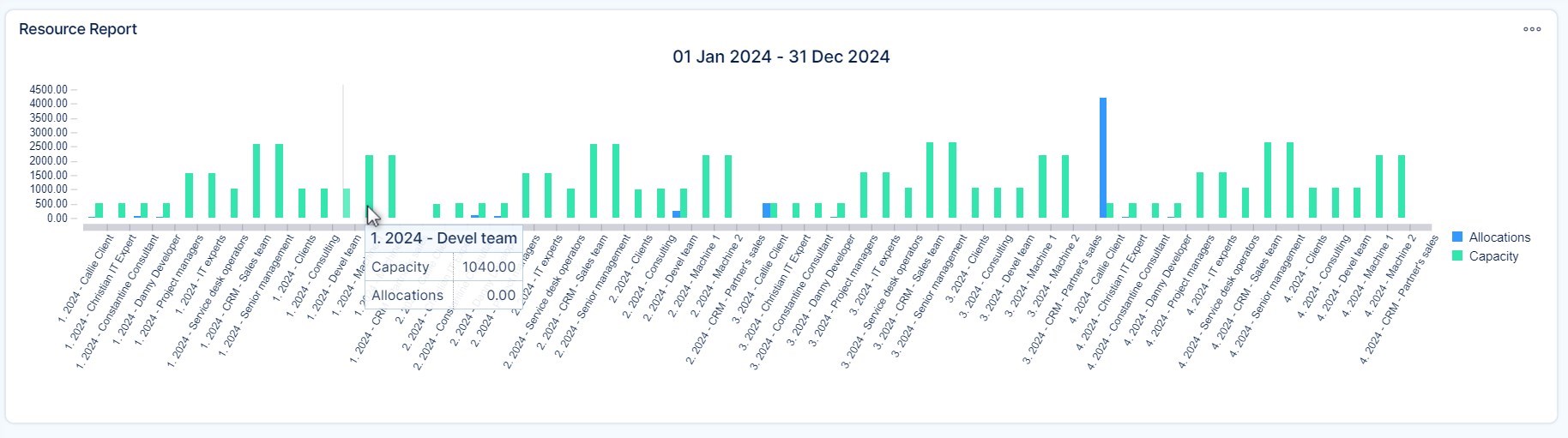 All data visible in the Resource Report is aggregated data from the Resource Management tool, only it is displayed in a different form. No data or calculations come from any sources other than Resource Management. A correctly configured Resource Report can look like this (list output at the top, the chart at the bottom).