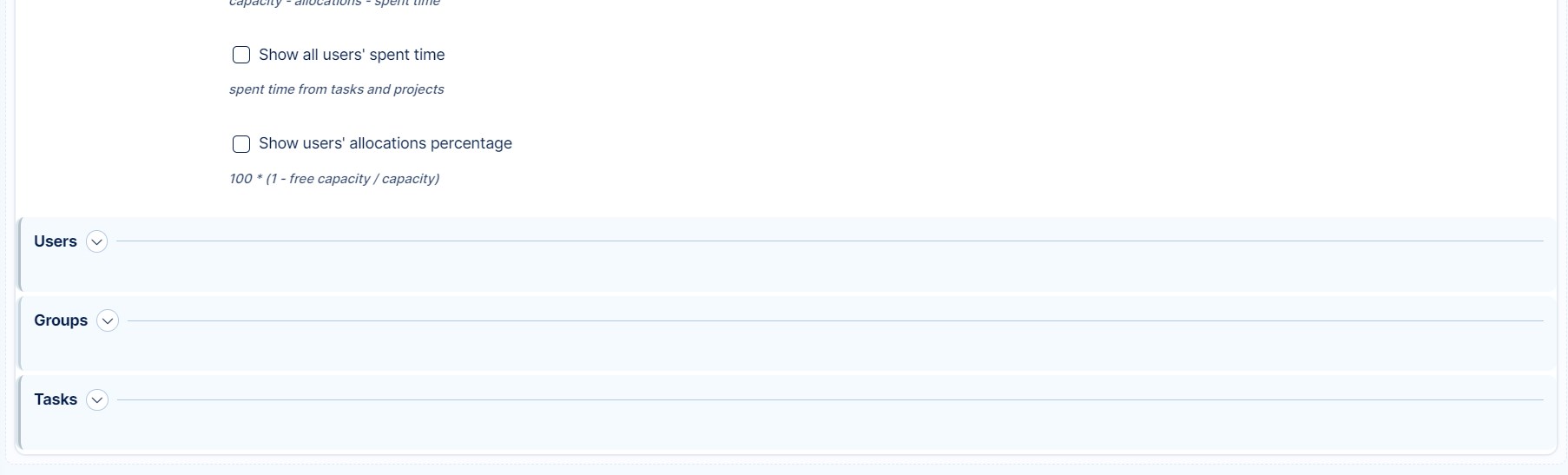 Below on the form, you can add your custom filters to Resource Report. The filtering is possible above users, groups, and tasks. If you do not set up a filter for groups, you will always see them. Filtering allows you to see only such entities you are interested in and omit all the rest. The same filtering is possible in Resource Management as well.