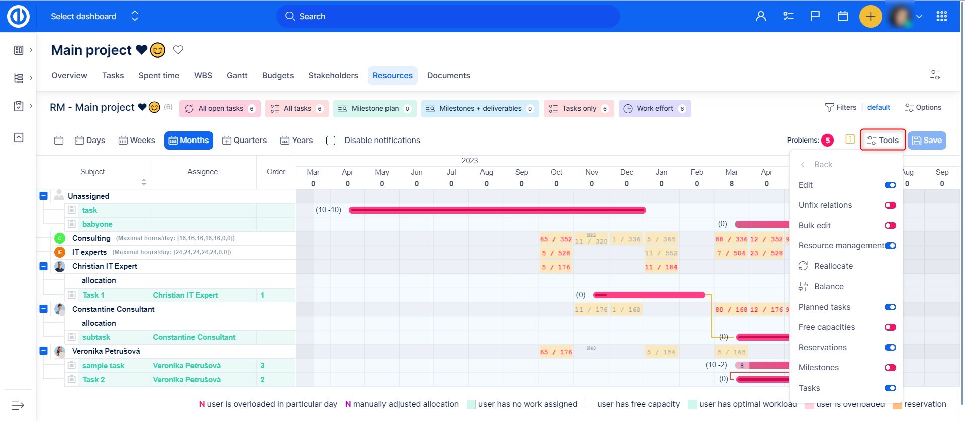The Balance feature can be found in the Tools menu of Resource Management, both on the global and the project levels. By clicking on it, all allocated hours of all displayed user-assigned tasks (i.e. those expanded/visible on the timeline, not those hidden/collapsed) will automatically redistribute throughout the entire task's duration (start date - due date) based on the user's free capacity, taking into account his daily working hours, vacations as well as other task allocations.