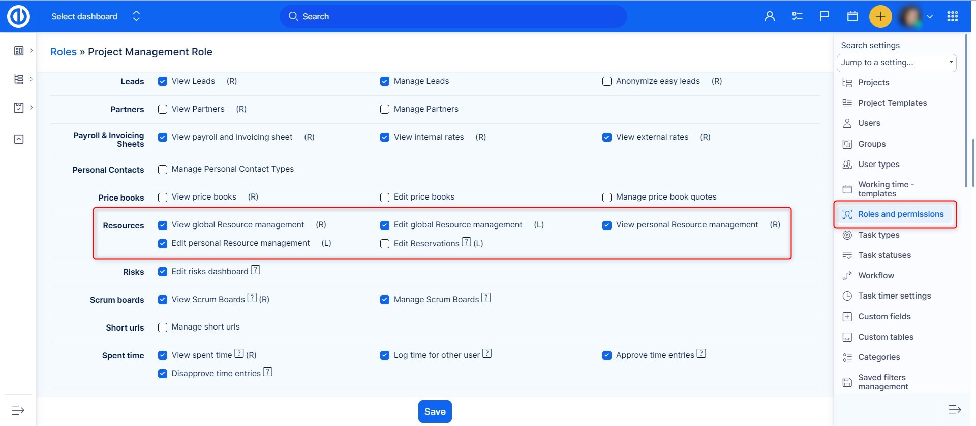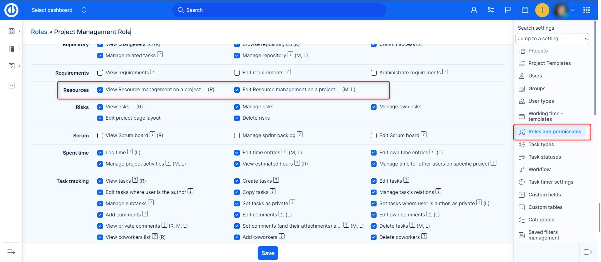 The permissions for Resource Management can be set up in Global menu >> Administration >> Roles and permissions >> Resources. Moreover, the Edit button (enabling you to work with Resource Management) is only available when the permission "Manage tasks relations" is enabled (can be found under Roles and permissions >> Project permissions >> Task tracking - Manage task's relations).