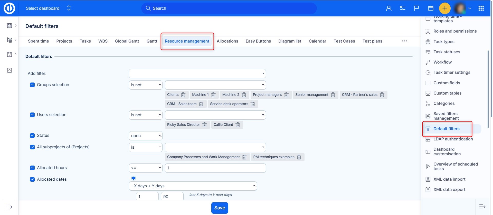 How to set up default filters for Resource Management