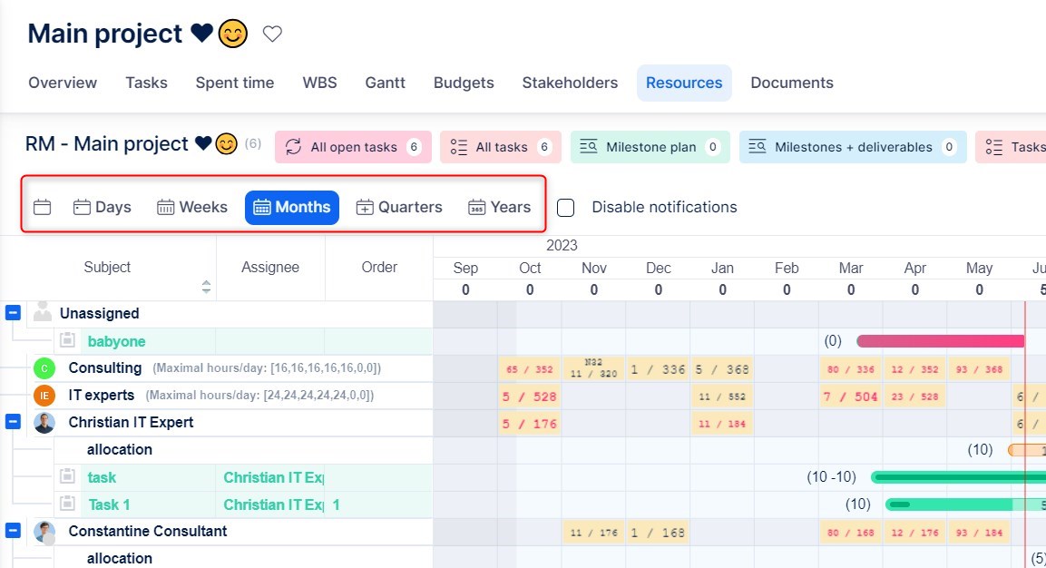 The timeline offers types of view: days, weeks, months and quarters. Based on the project length and the necessary level of detail, they can be switched between from the top menu.