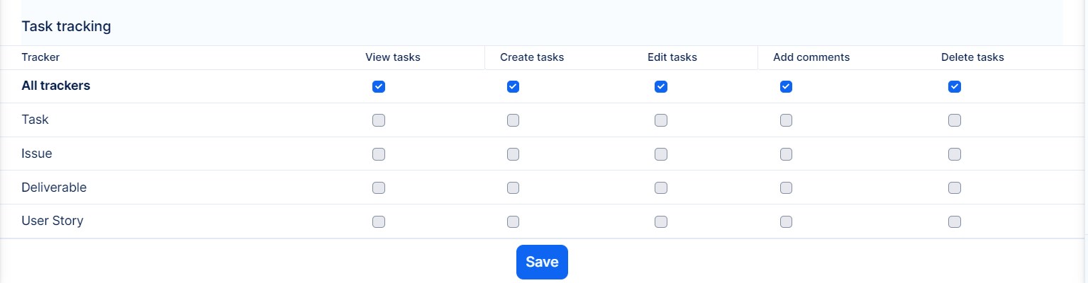 Here you can set in detail for each role, which actions regarding Tasks can be done under which Tracker: