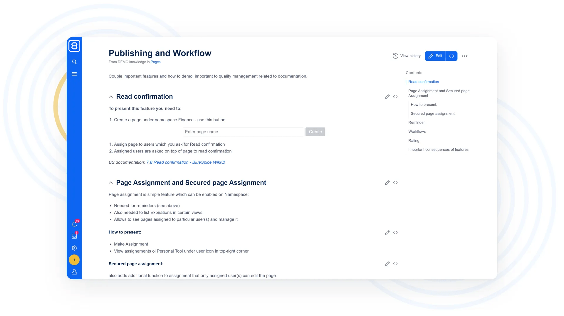 Aprovecha el robusto editor visual para crear y editar fácilmente artículos, bases de datos, diagramas, imágenes, código de software, utilizar plantillas de contenido o simplemente importar tus documentos existentes.