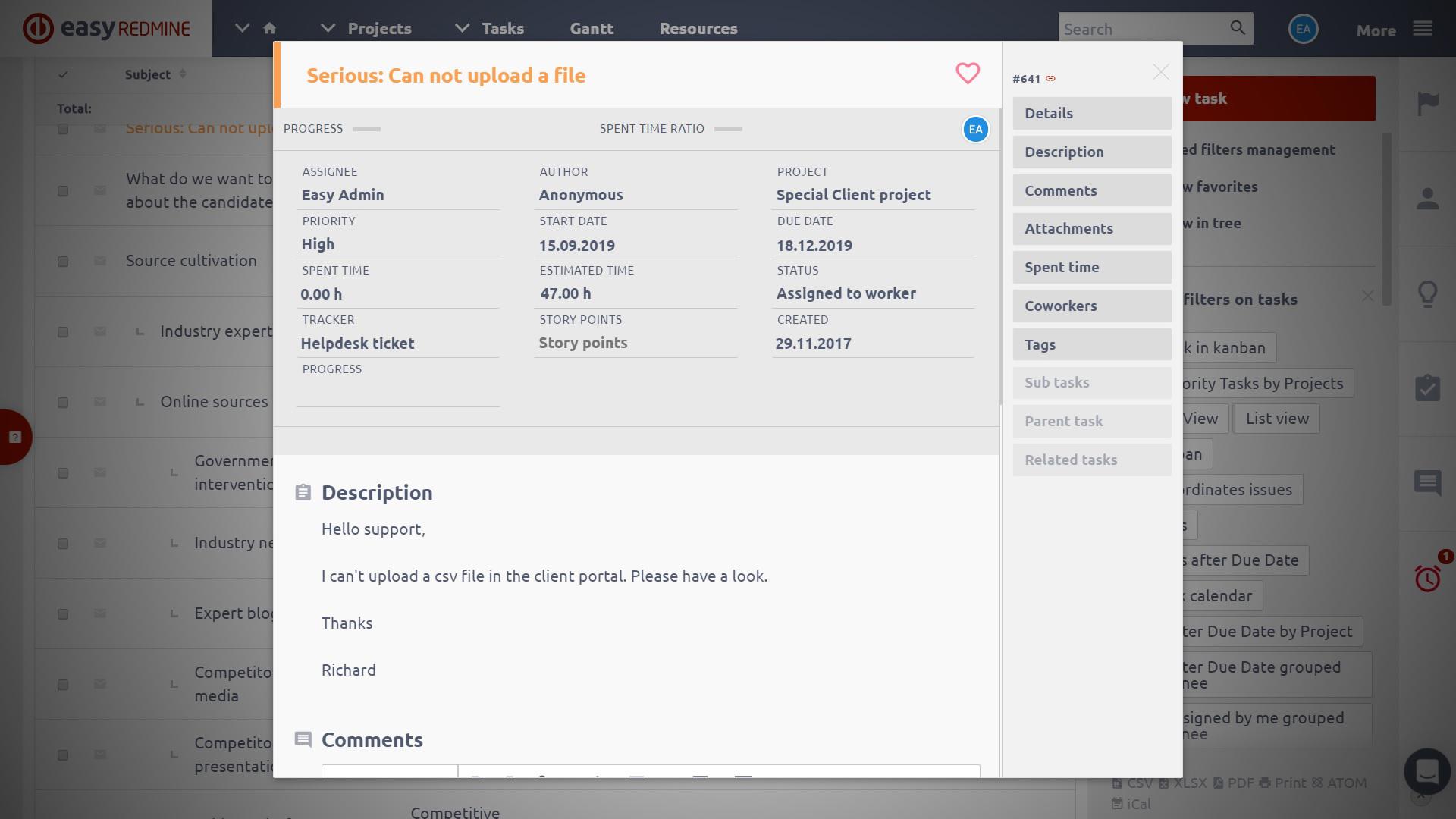 Help Desk 2019, c'est le meilleur service d'assistance de Redmine ! Les commentaires des utilisateurs ont été entendus et Easy8 Help Desk s'est vu, en conséquence, doté de quelques fonctionnalités qui manquaient auparavant et qui en font désormais un outil de service d'assistance complet. Voici les nouvelles fonctionnalités de Help Desk 2019 d'Easy Redminer: