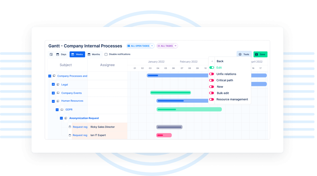 Egyszerűsítse a komplex folyamatokat a Gantt-diagram segítségével! Az Easy Gantt-ban fogd és vidd módszerrel tervezheti és módosíthatja a határidőket, feladatokat hozhat létre, mérföldköveket állíthat fel, kapcsolatokat határozhat meg, részfeladatokat delegálhat - mindezzel gyorsítva, valamint áttekinthetőbbé és harmonizáltabbá téve a folyamatot.