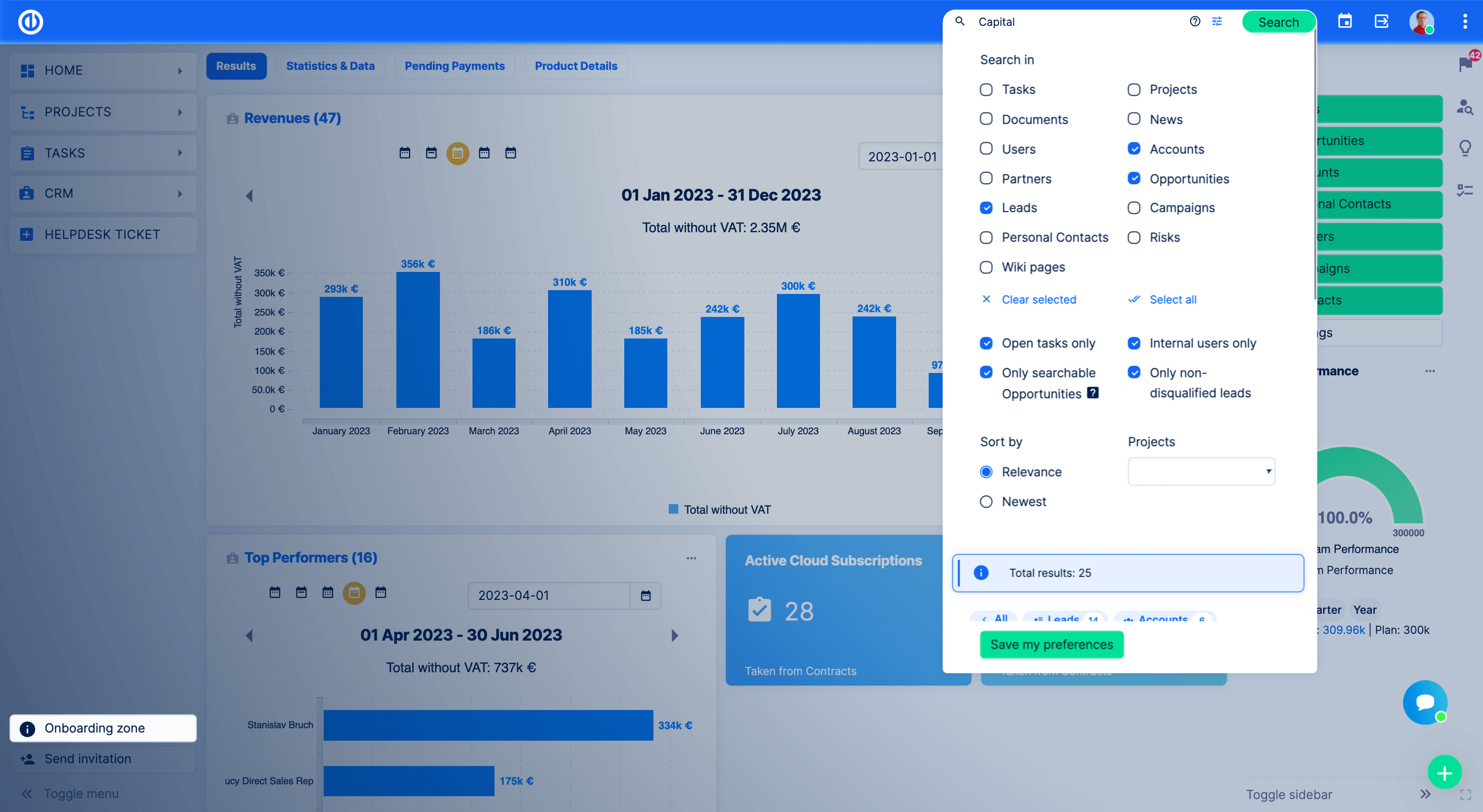 - Keresés testreszabása - Minden felhasználó más, gyakran a munkakörétől függően. Ezért most testre szabhatja! Ha értékesítési területen dolgozik, állítsa be a keresést például "Számlákra" vagy "Leads"-re, a fejlesztőknek pedig "Feladatokat", a projektmenedzsereknek pedig "Projekteket".