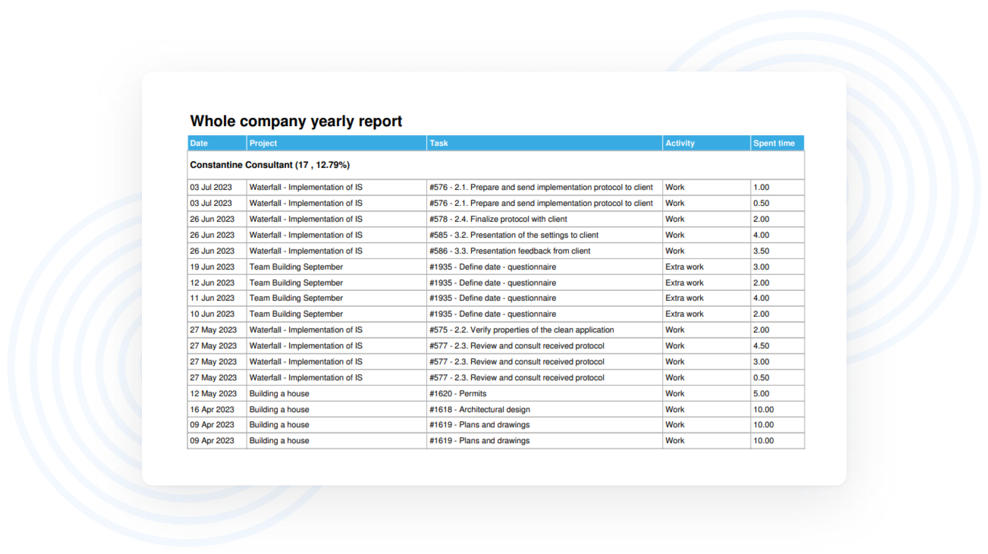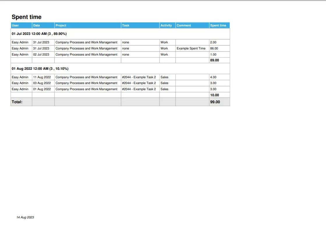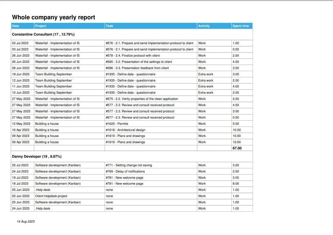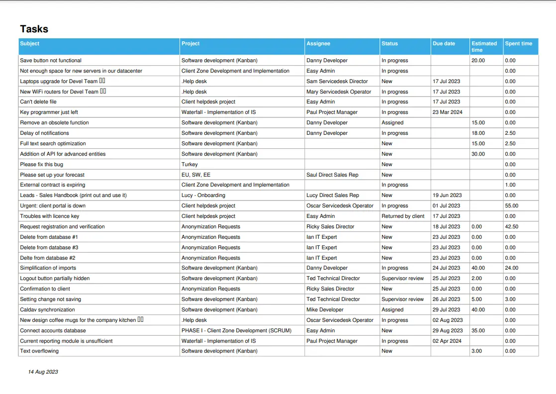 Tutti gli elenchi di dati dal sistema possono essere esportati in un file PDF con il tuo logo e i colori dell'azienda. Esempi di esportazioni: qualsiasi lista di attività, lista di progetti, voci di tempo trascorso, esportazione dettagli attività, ecc.