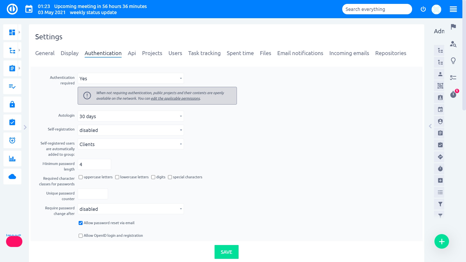 Quando attivata, questa funzione attiva una serratura se un utente inserisce una password errata diverse volte, in modo che riceva un avviso su quanto tempo l'account sarebbe disabilitato prima che il prossimo tentativo di accesso sia consentito di nuovo. Puoi configurarlo in Altro » Amministrazione » Impostazioni » Autenticazione » Tentativi di accesso non riusciti.