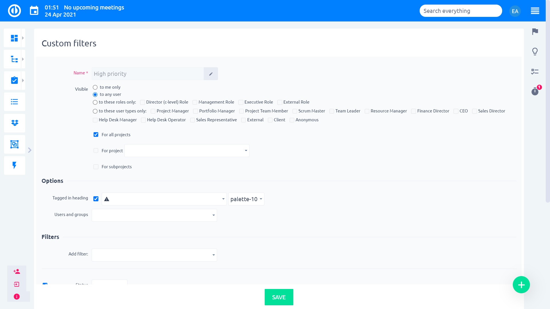 Un nuovo campo personalizzato di formato colore può essere aggiunto a qualsiasi entità supportata, come progetti, attività, contatti, ecc. Il campo personalizzato fornisce agli utenti la scelta di tre colori (bandiere) tra cui selezionare - verde, arancione, rosso. Ogni colore rappresenta un indicatore scelto manualmente ed è a discrezione degli utenti a quale significato associare quei colori. Caso d'uso: Spesa di bilancio - verde, Conformità al programma - arancione, Responsività del cliente - rosso.