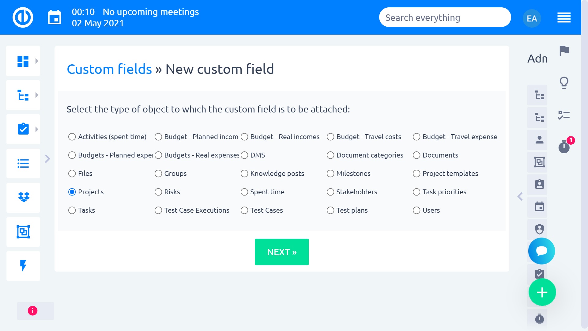 - Un campo personalizzato di formato colore - un nuovo campo personalizzato di formato colore può essere aggiunto a qualsiasi entità supportata, come progetti, compiti, contatti, ecc.