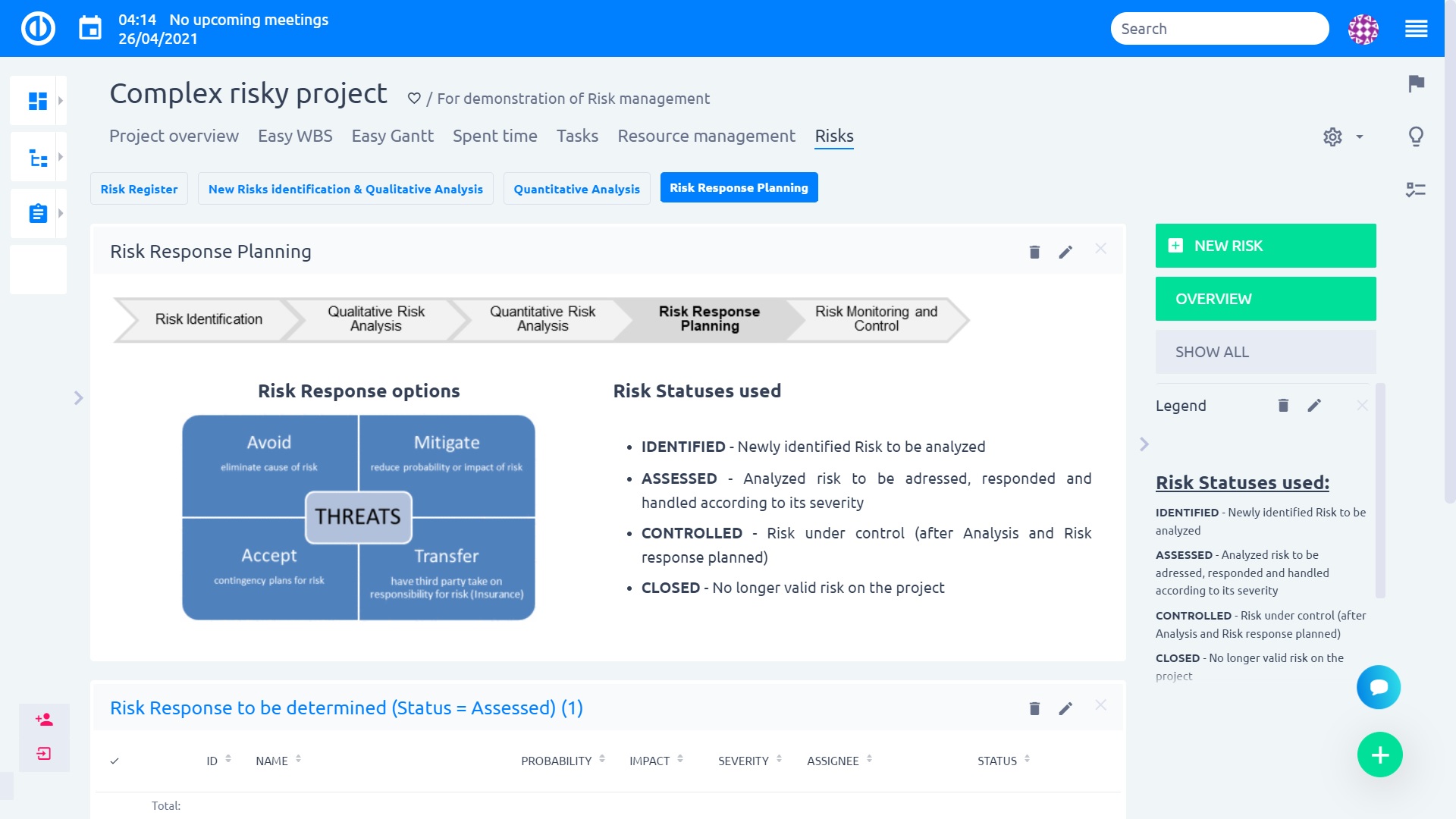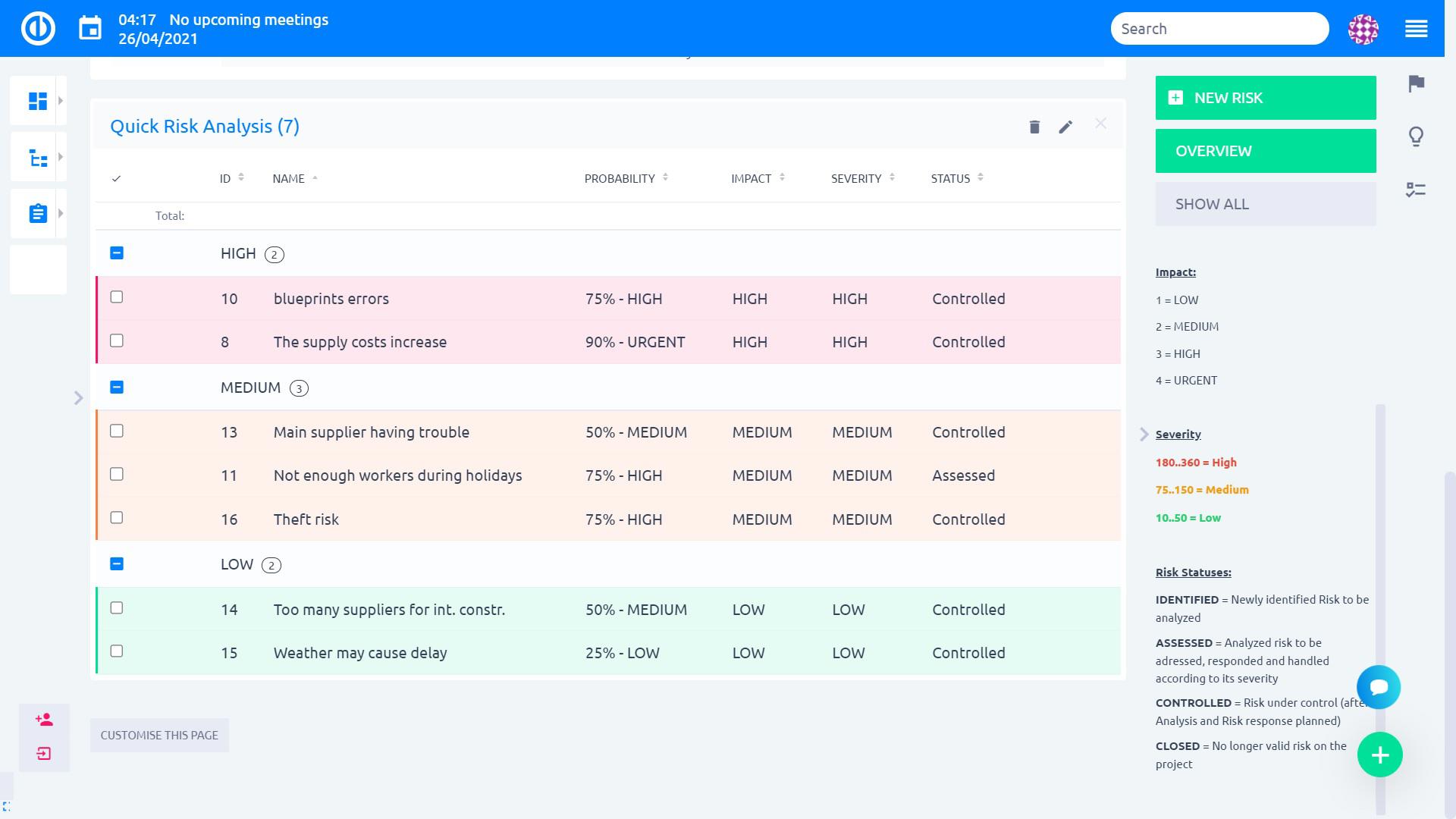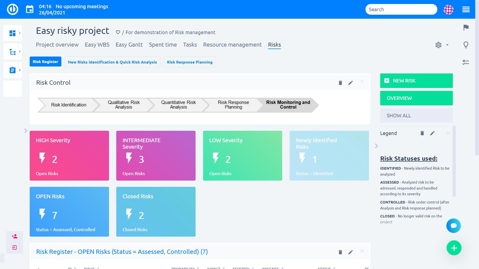 La gestione del rischio è un processo essenziale per qualsiasi progetto ben gestito. Pertanto, il nuovo plugin Easy8 porta tutte le funzionalità necessarie per l'identificazione, la valutazione, il monitoraggio e l'evitamento del rischio.
