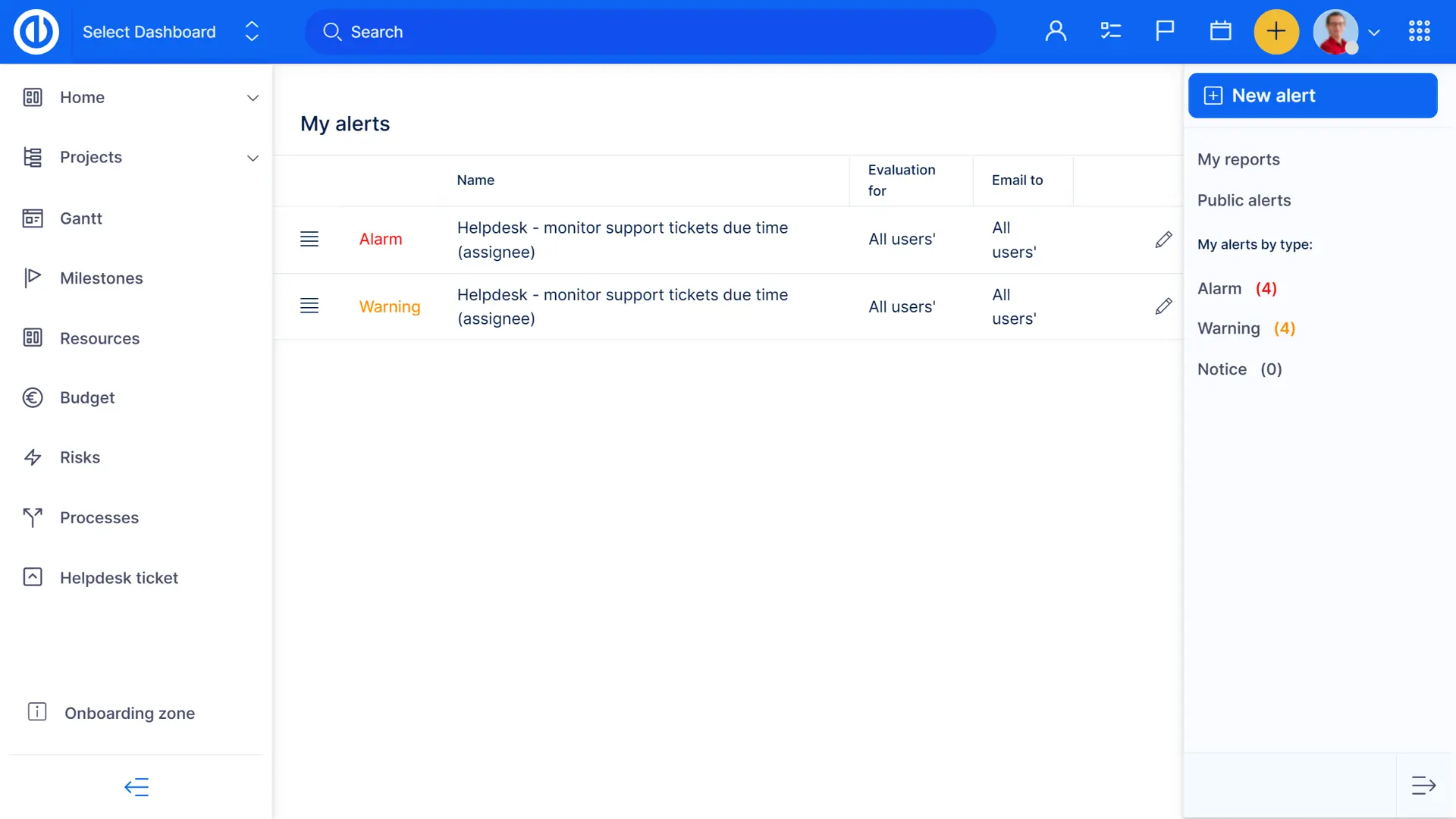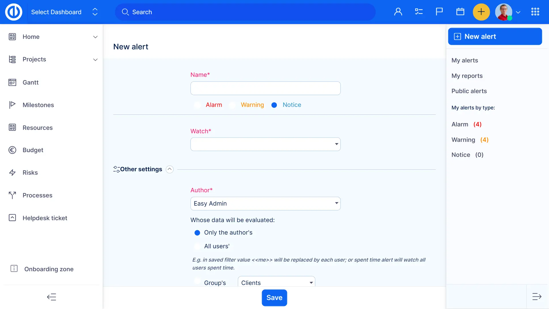 - Configurazione delle condizioni per la notifica su attività, progetti, milestone