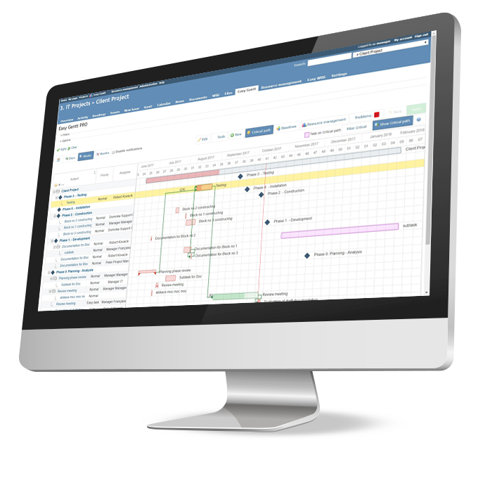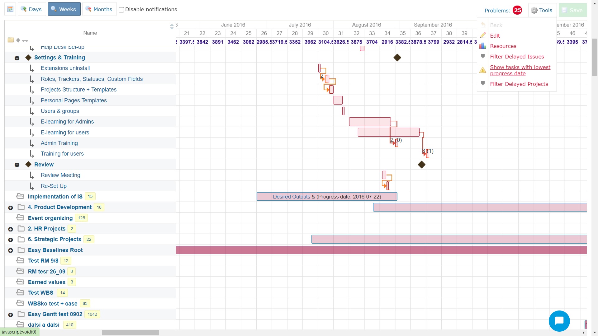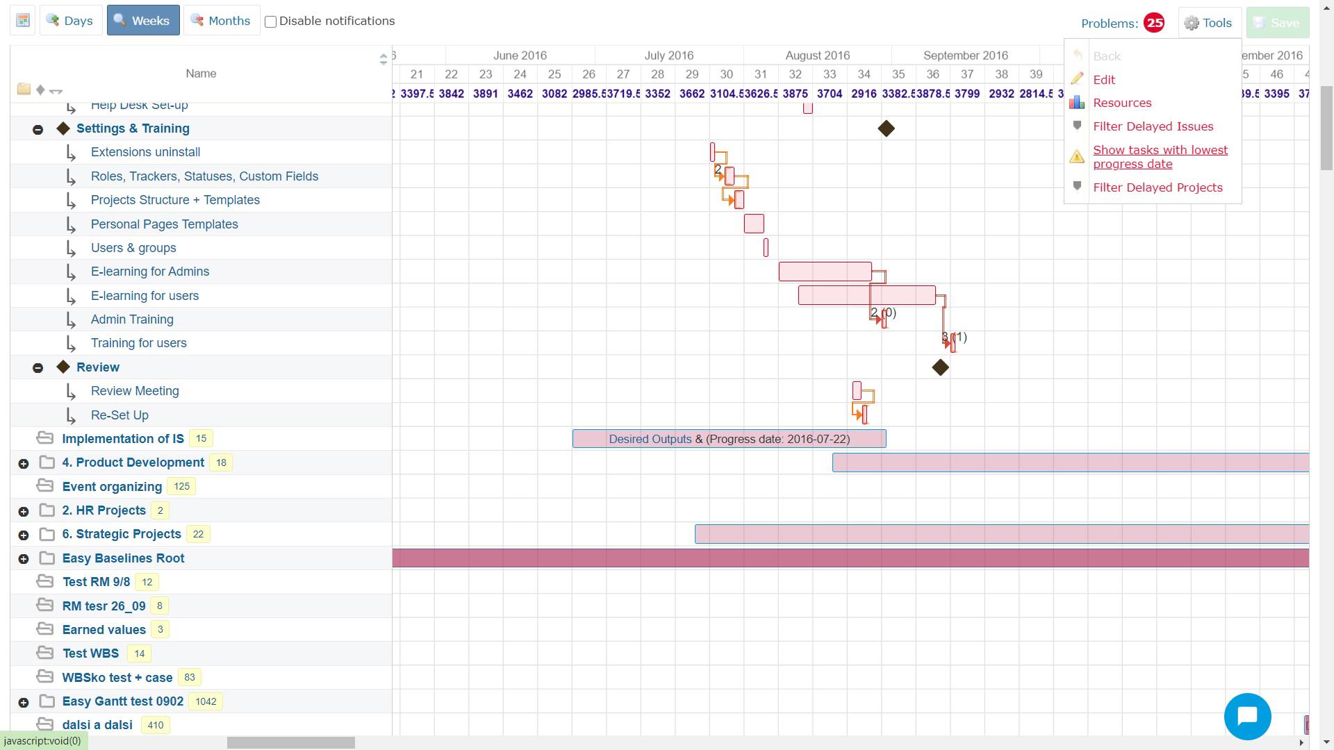 プロジェクト管理では、ベースラインはプロジェクトの元の計画です。 この元の計画は、現在のプロジェクト計画と比較するために視覚化されます。 Easy Gantt は、ベースライン計画を強調表示する機能を提供します。 スケジュールを編集してもベースラインプランは変更されません。 Redmine ガントチャートを使用すると、より多くのベースラインを作成できます。これにより、プロジェクト計画のスナップショットとして機能します。.