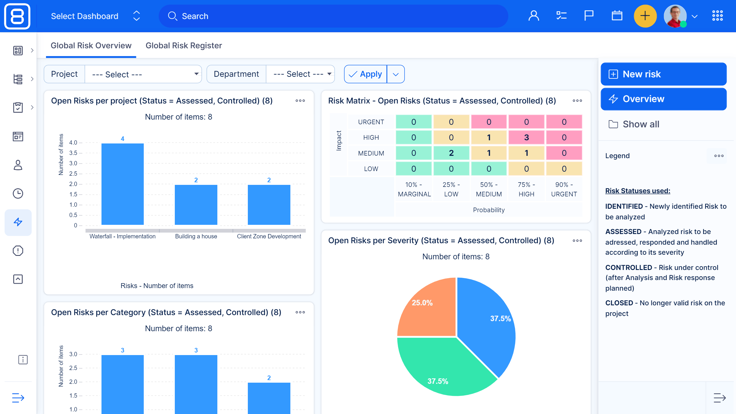 위험 관리는 각 프로젝트 점검을 하는 필수 과정입니다 . 위험요소에 대하여 관리하며, 글로벌 관리 보고 및 관리 개요를 제공할 수 있습니다.