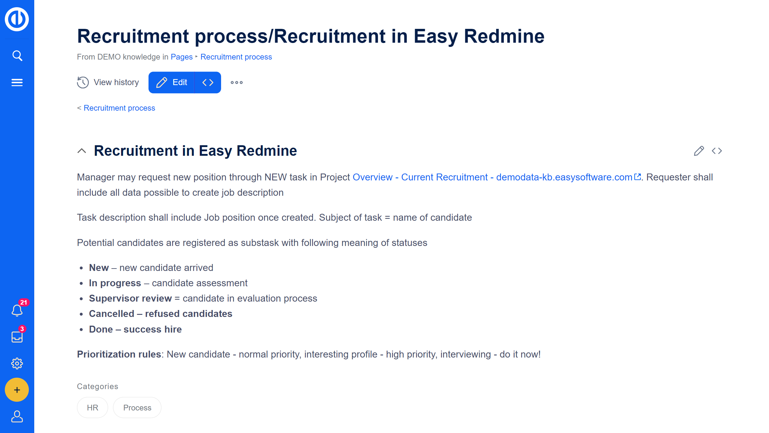 인기 있는 오픈 소스 MediaWiki 기술과 전문 배포 BlueSpice를 기반으로 합니다. Easy8 환경에 잘 통합되어 있으며 조직에서 문서, 프로세스, 설명서, 품질 관리 및 기타 지식 유지 관리 요구 사항을 구성하고 확장하기 위한 강력한 도구 세트를 제공합니다.