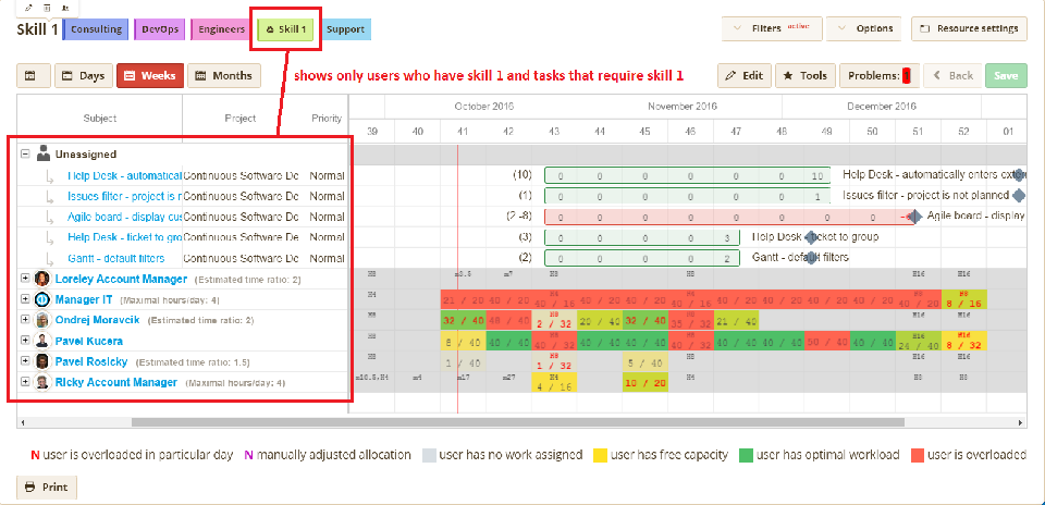 Now, the filter is created. We recommend selecting "Tagged in heading" in the filter settings to make it easily accessible directly from the global level of resource management. Then just click on this label in the header and immediately see a list of users having skill 1 as well as tasks requiring skill 1.