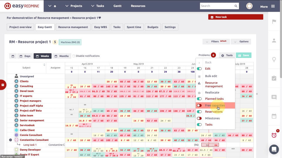 The uniqueness of this Redmine Resource management plugin by Easy is in visual planning across the projects with regard to real-time capacities and competencies of workers and the drag&drop user interface.