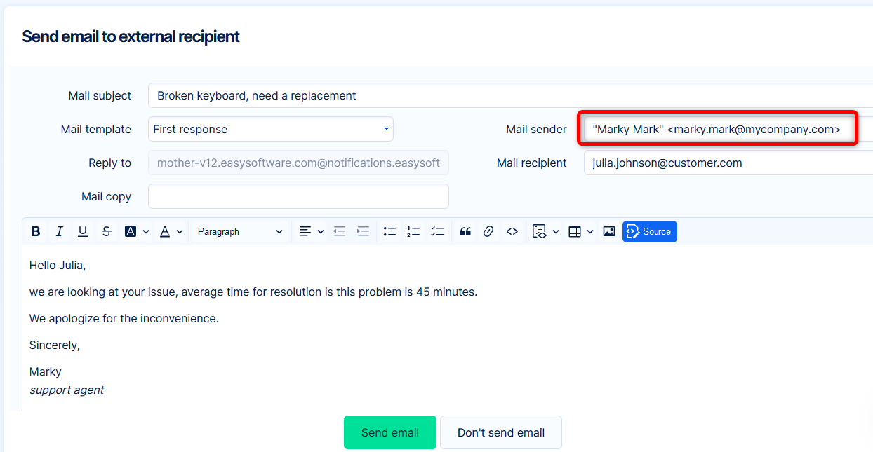 Marky chce napisać wiadomość do klienta za pośrednictwem Helpdesku. Na podstawie powyższych ustawień, zostaje automatycznie wpisany jako nadawca.