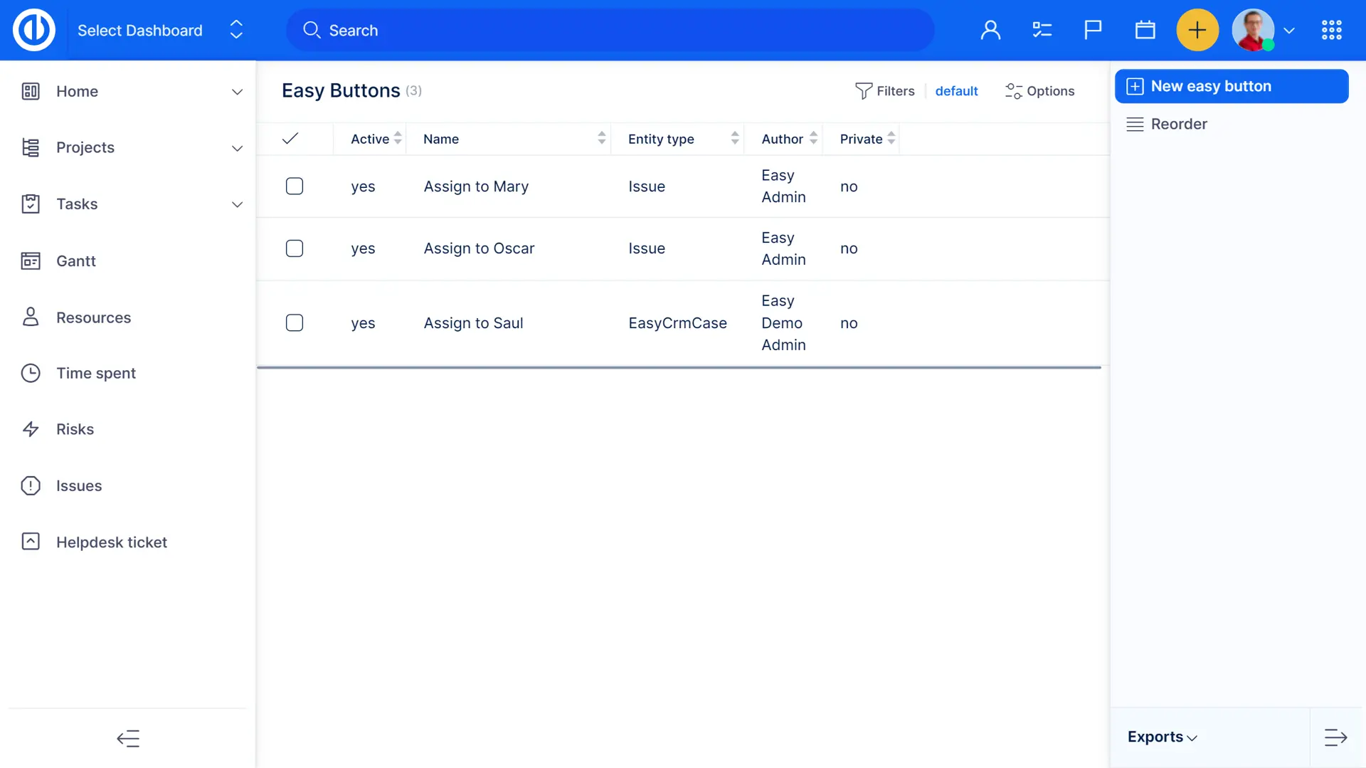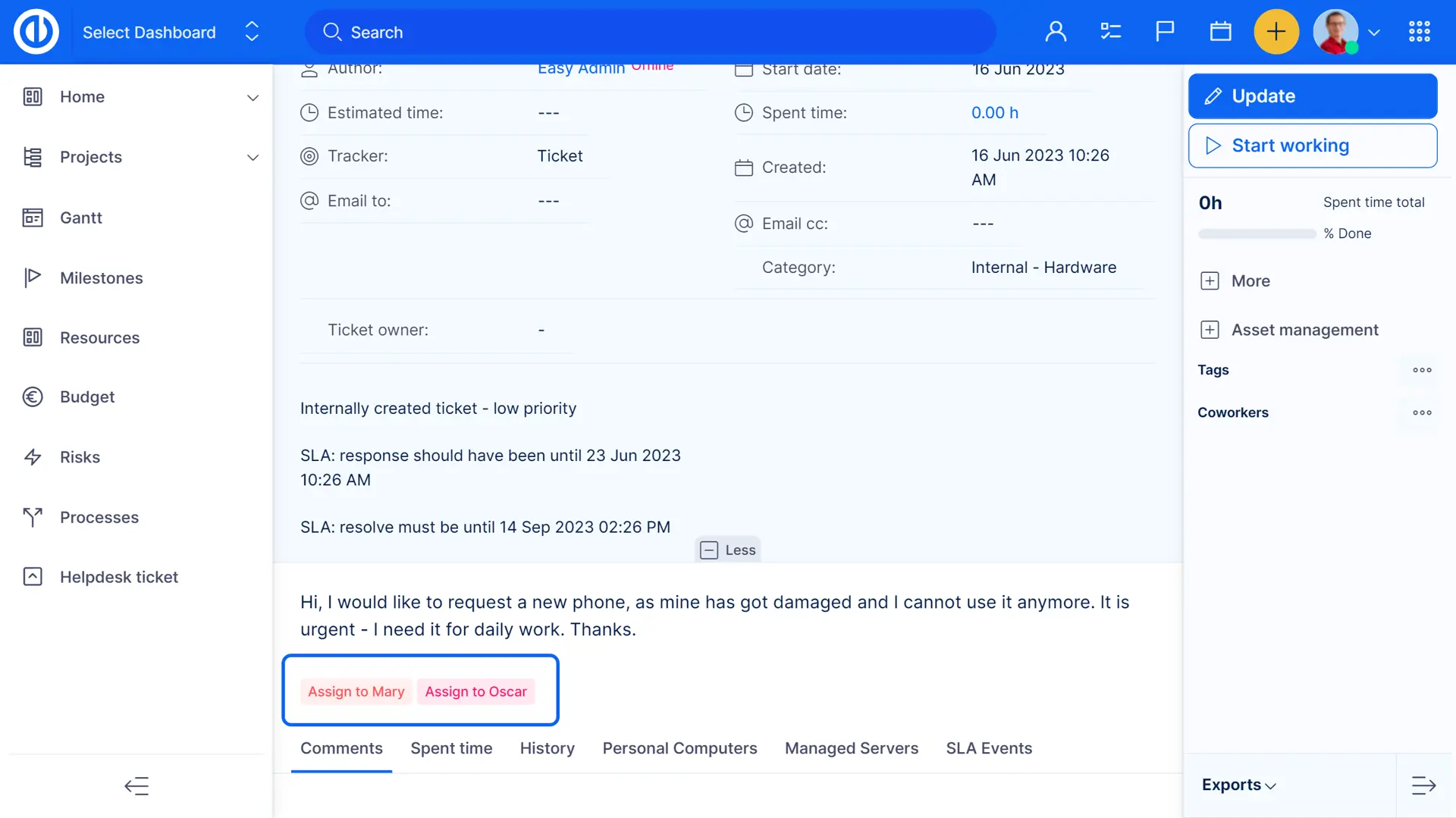 Przyspiesz powtarzające się czynności, takie jak aktualizacja zadania lub przypisanie zgłoszenia do wybranego pracownika, używając przycisków akcji. Wystarczy otworzyć wybrane zadanie (lub zgłoszenie) i nacisnąć przycisk akcji, który może wykonać dowolną aktualizację zadania, w tym zmianę osoby odpowiedzialnej, śledzenia lub priorytetu.