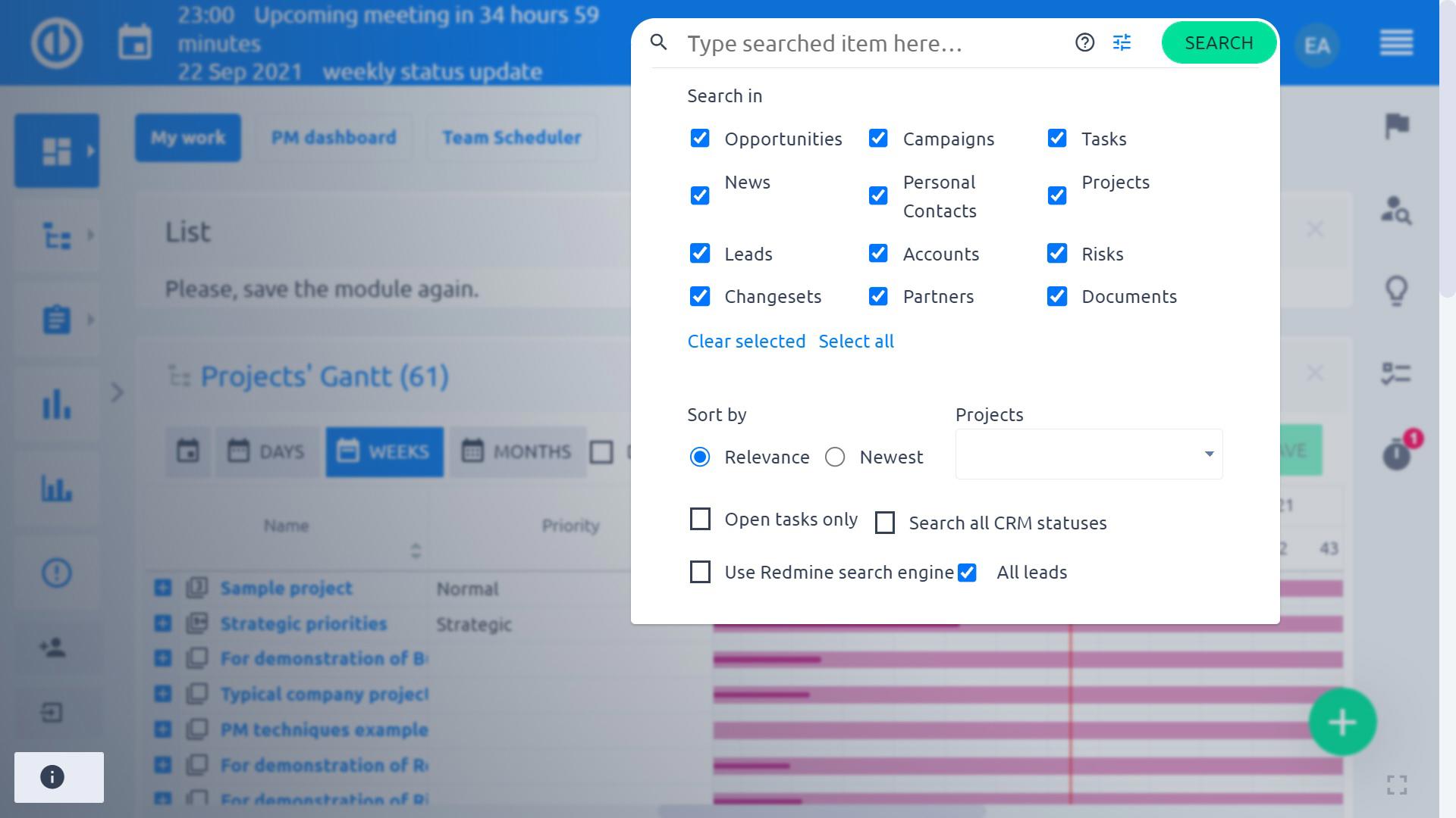 Przyspieszyliśmy nasze wyszukiwanie w aplikacji, wykorzystując nową technologię i porzucając starszą wersję natywnego wyszukiwania Redmine. Teraz jest to ponad 10-krotnie szybsze i oferuje również bardziej przejrzysty i nowoczesny interfejs użytkownika wyników wyszukiwania w widoku modalnym.