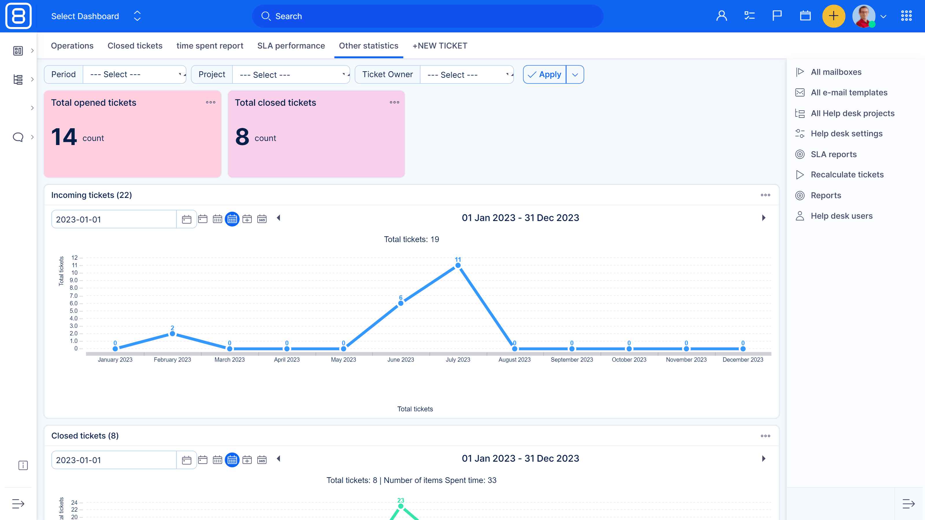 Try the integrated Help desk solution by Easy8 for improved customer care and smoother processing. There are two basic ways of creating tickets – from e-mail or from a simplified user interface. Tickets are stored in projects where you can define SLAs, pre-paid hours, transfer 'unused' hours, and easily generate reports.