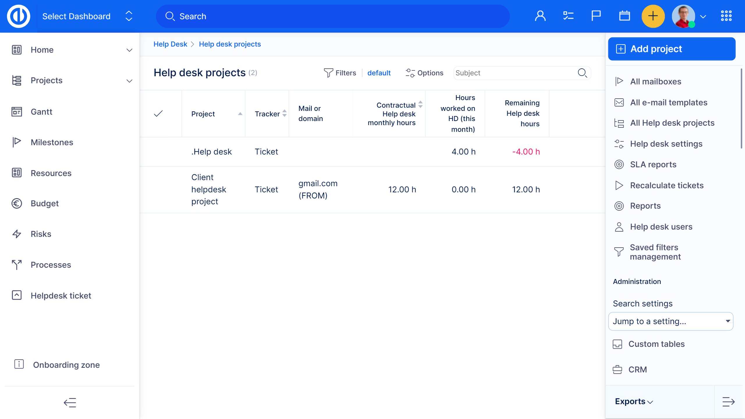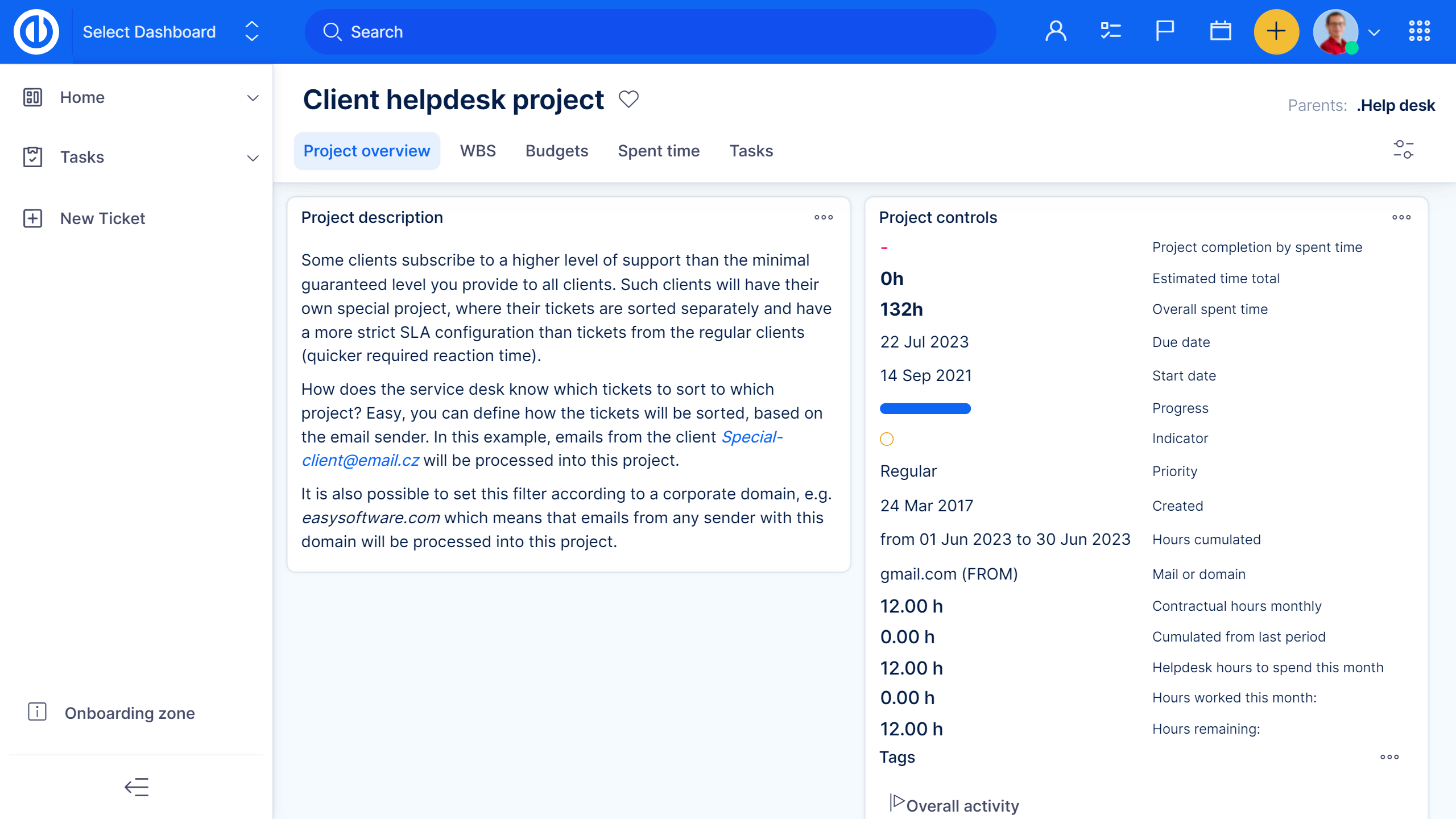 Chcesz mieć jasny przegląd swoich klientów wsparcia? Funkcja projektu HelpDesk może Ci w tym pomóc! Przegląd projektu pozwala na ustawienie i obserwację liczby godzin umowy zgodnie ze SLA, liczby godzin, które już zostały przepracowane oraz pozostałych godzin. Dodatkowo zapewnia kodowanie kolorów dla każdego projektu, co daje ładne wizualne przedstawienie bieżących statusów projektów. Ponadto, możesz łatwo kategoryzować swoje projekty, na przykład na podstawie ważności danego klienta lub poziomu świadczonych usług. Oczywiście w ramach każdego konkretnego projektu istnieje jego własny przegląd, który przechodzi w większe szczegóły - raporty dotyczące zgłoszeń, zdarzenia SLA, karty czasu itp.