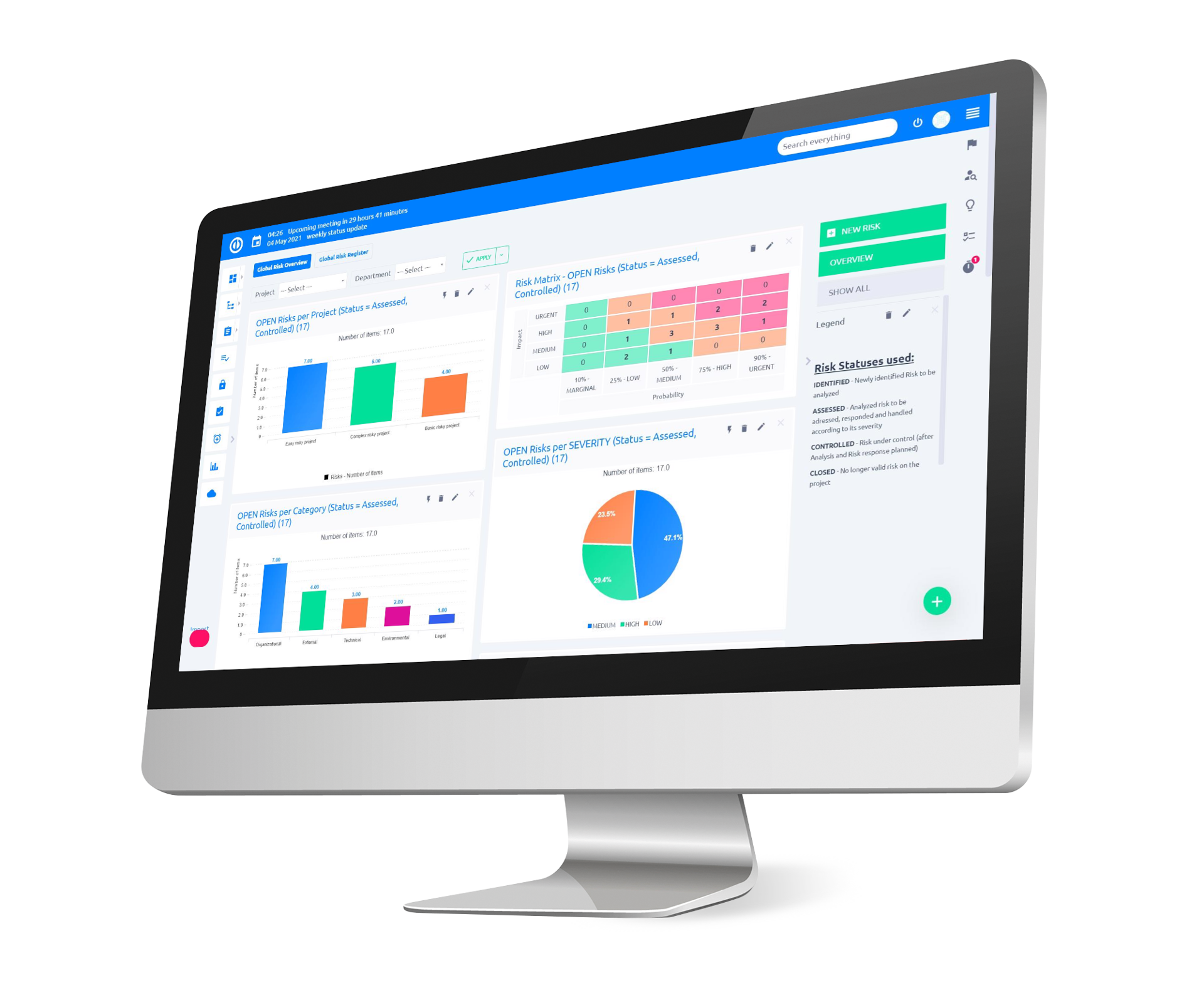 Zarządzanie ryzykiem jest obowiązkowym procesem dla każdego poprawnie zarządzanego projektu. Narzędzie to pozwala na ustawienie macierzy ryzyka w całej organizacji, zarządzanie ryzykami w projektach oraz dostarczanie globalnego raportowania i przeglądu ryzyka dla zarządzania. Moduł globalny jest odpowiedni dla ról Kierownik Linii, Menadżer Ryzyka lub Oficer Zarządzania Projektami (PMO), podczas gdy moduł projektowy jest optymalny dla Kierownika Projektu, pozwalając mu na zarządzanie ryzykiem projektu w kontrolowany sposób dla każdego konkretnego projektu pod jego nadzorem.