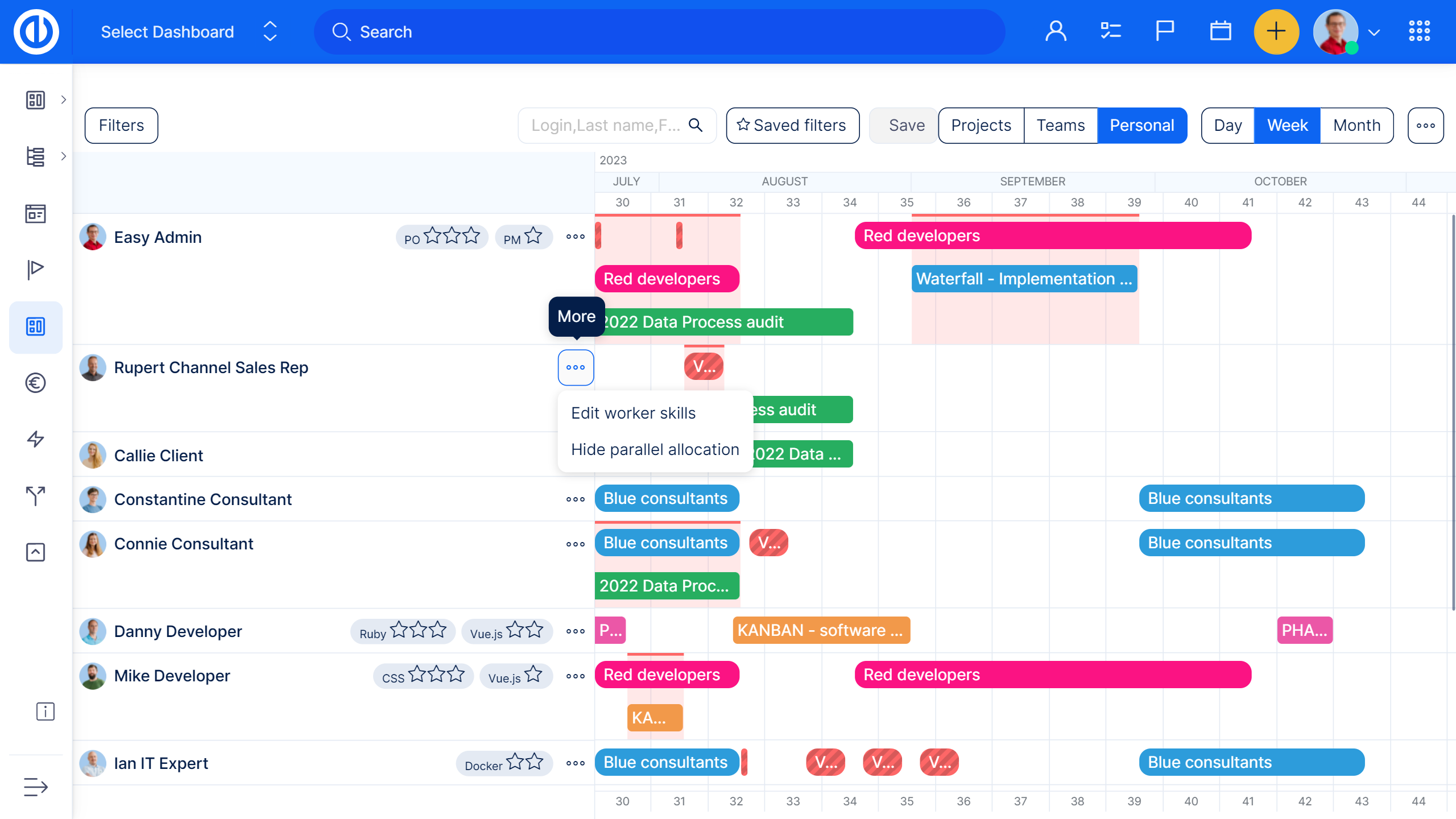 Easy8 offers a robust solution for visual resource planning across all your projects, combining simplicity with powerful capabilities. This resource management software is distinguished by its intuitive drag-and-drop interface, enabling managers to plan tasks effortlessly while considering the real-time capacities and unique competencies of team members.