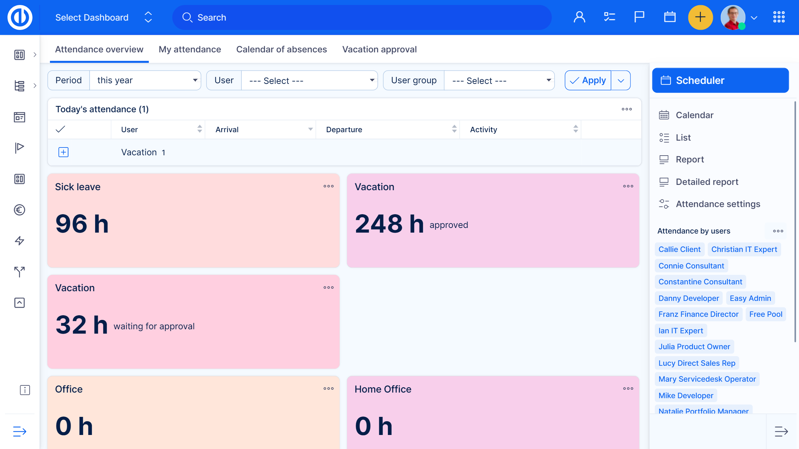 This dashboard gives you a snapshot of when your employees and/or colleagues are present at your business office, home office, have break or are absent. It allows you to easily create custom reports for the Finance office’s budgeting needs.