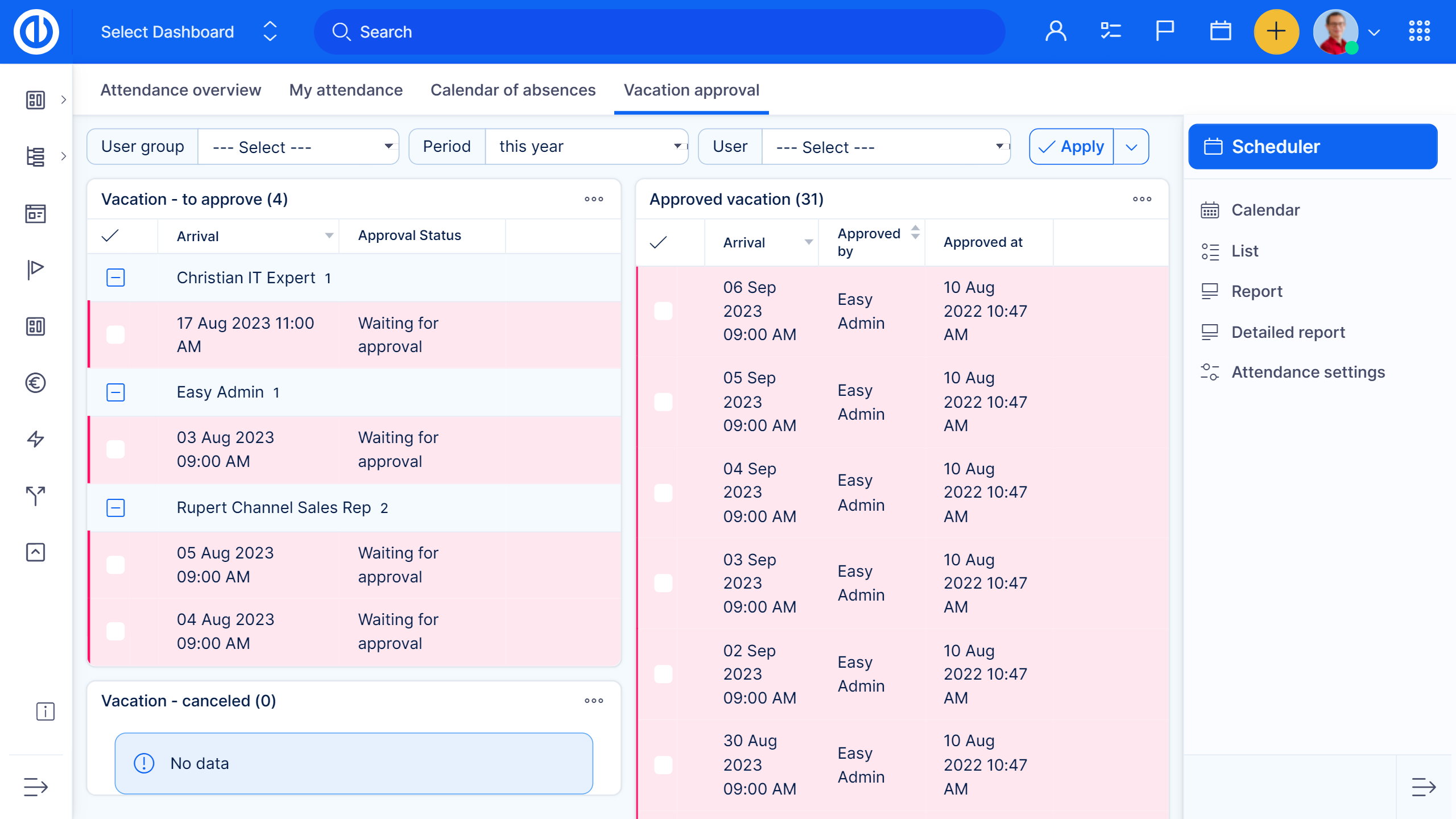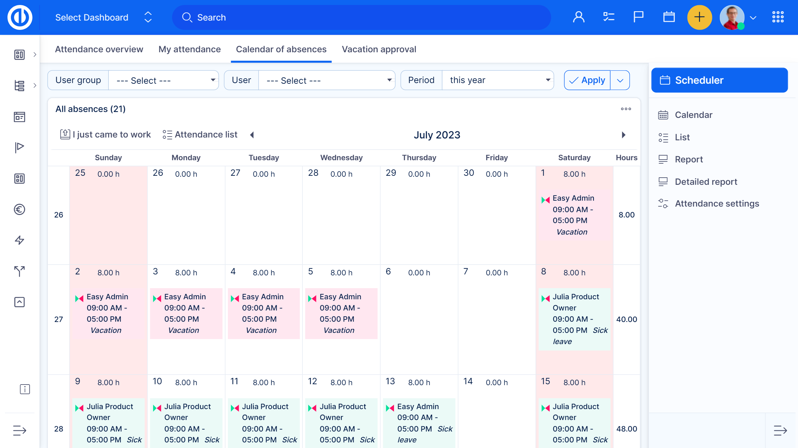 This feature of Resource Management systemizes attendance tracking within a comprehensive resource management system. Employees can plan and log attendance directly through their personal page calendar, ensuring seamless integration with resource planning workflows. Managers gain full oversight with attendance plans, detailed sheets, and statistics for all team members, alongside the ability to approve, decline, or comment on leave requests.