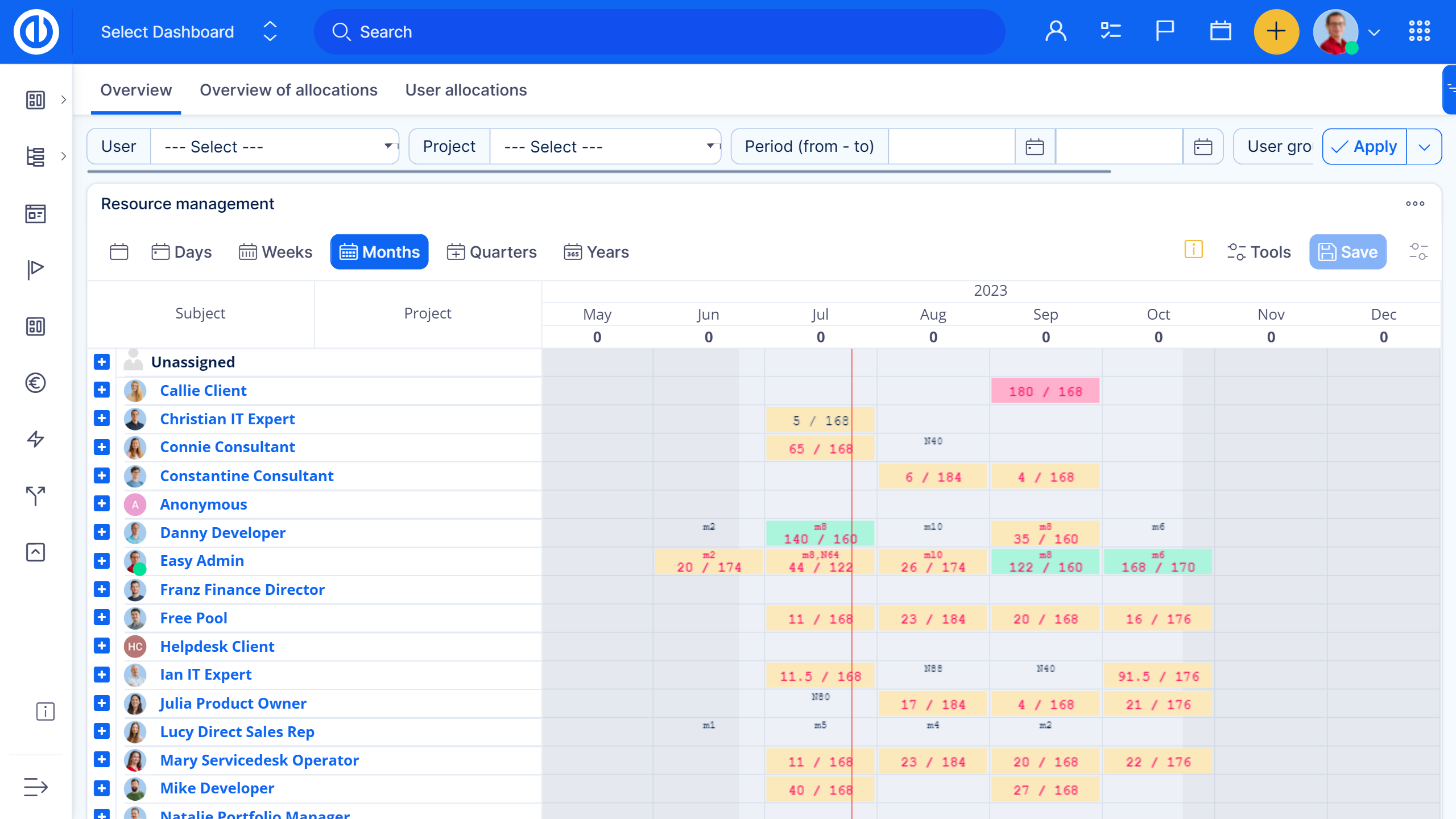 The Resource Dashboard is an extension for Resource management. This feature for resource planning provides you with a visual overview of all your resources on one dashboard. Take just one look at this dashboard and get instant insight into your KPIs and resource utilization levels.