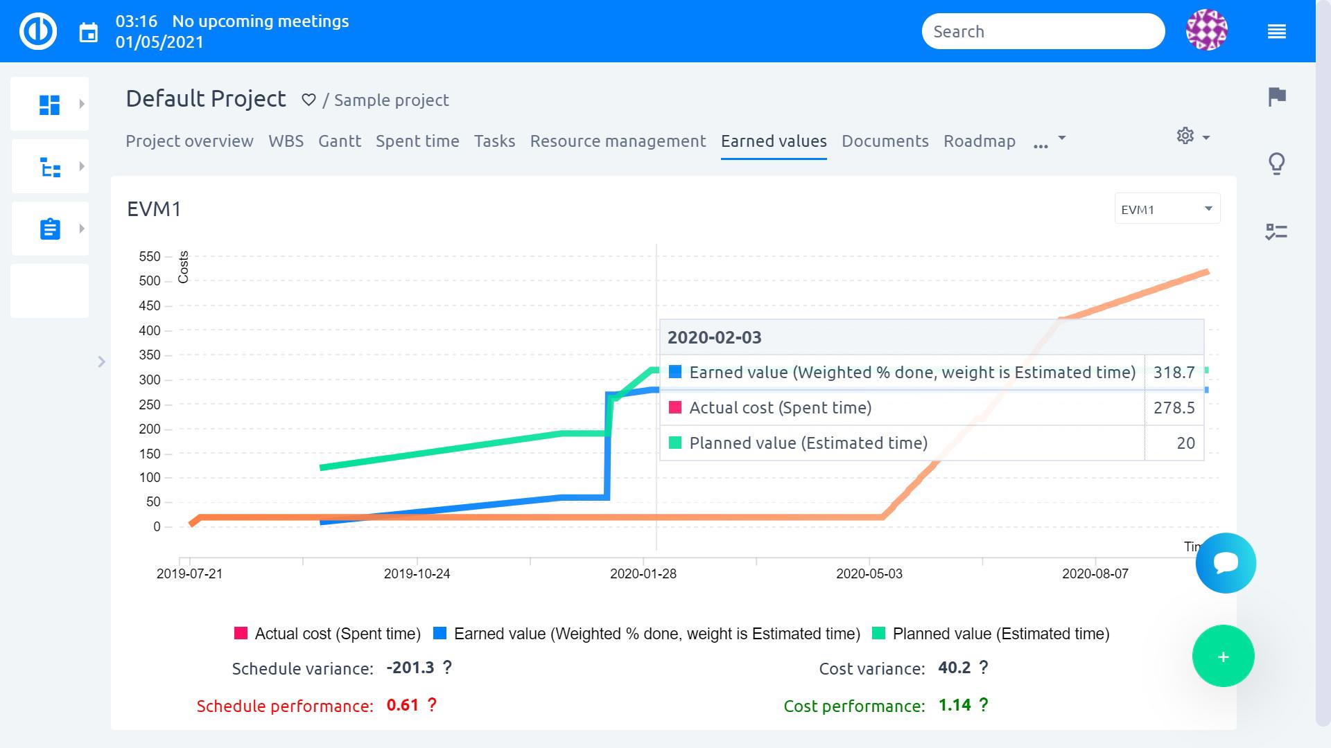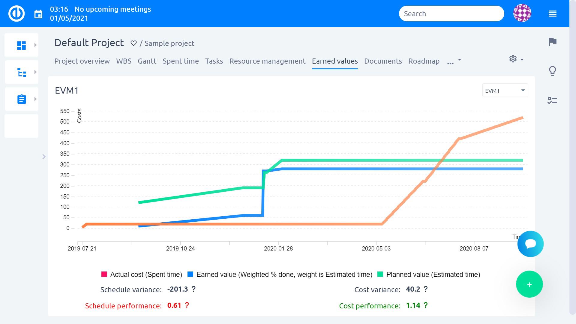 Earned Value Management is based on monitoring three main aspects of the project in order to reveal the health of the project: Planned Value (PV), Earned Value (EV), and Actual Cost (AC). Moreover, it monitors each project progress with the following indices: Schedule Variance (SV), Schedule Performance (SP), Cost Variance (CV), and Cost Performance (CP).