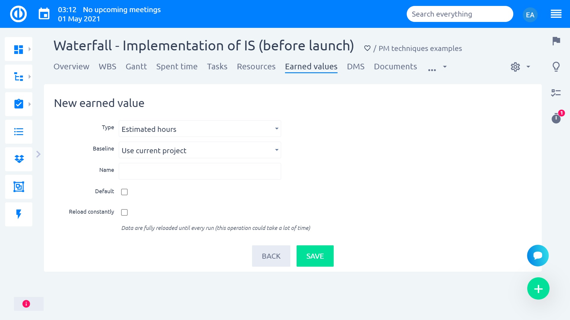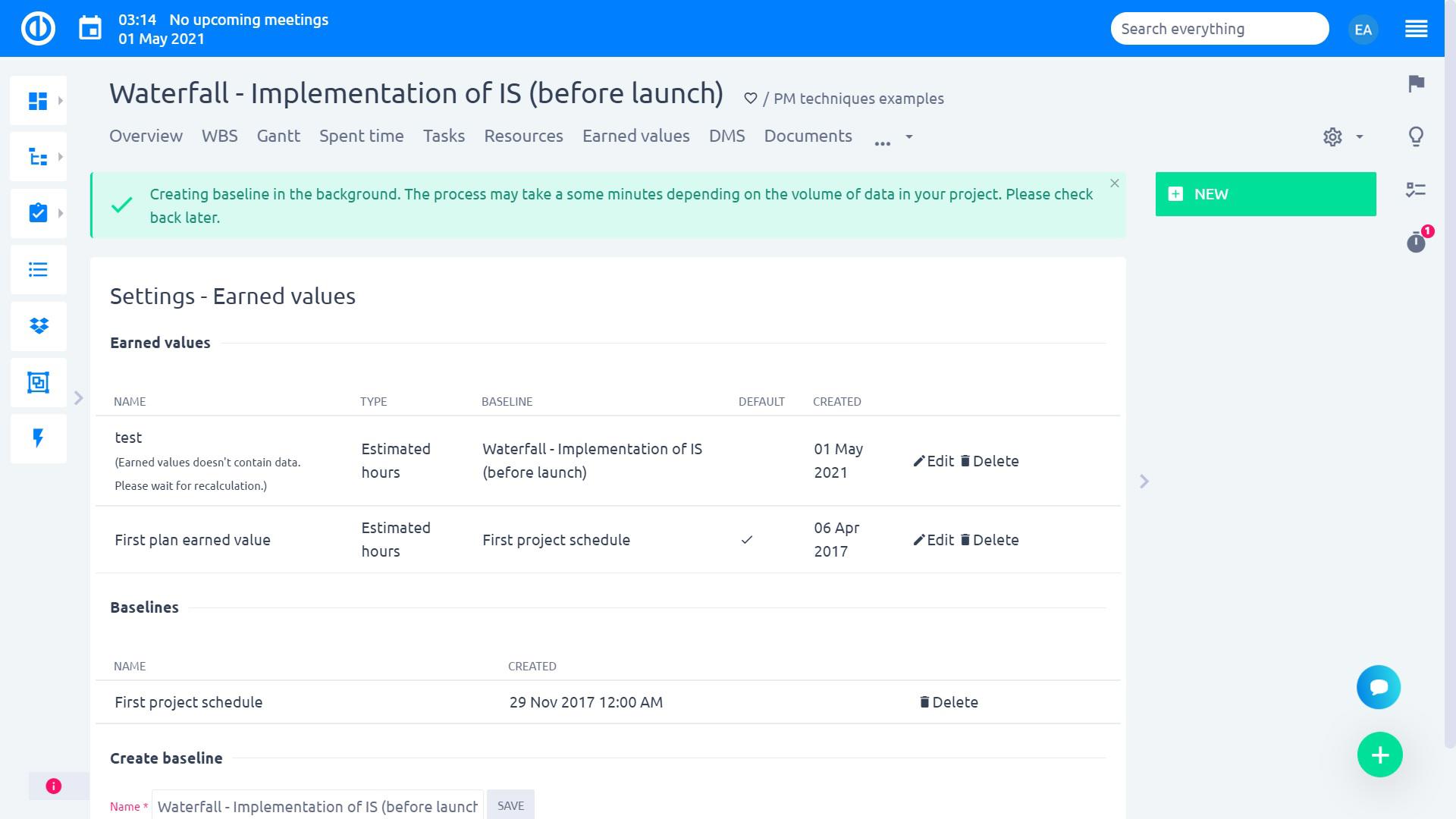 Since Earned Value Management is a project-level module, it can be enabled for one or more selected projects. In order to create baselines, which are necessary to set planned values, and make the plugin show data, Easy Gantt and Easy Baselines modules must be enabled on the project as well. A baseline itself always needs to be created using Easy Gantt module. A baseline represents your desired project target, which is illustrated by the "Planned value" curve on an EV chart.
