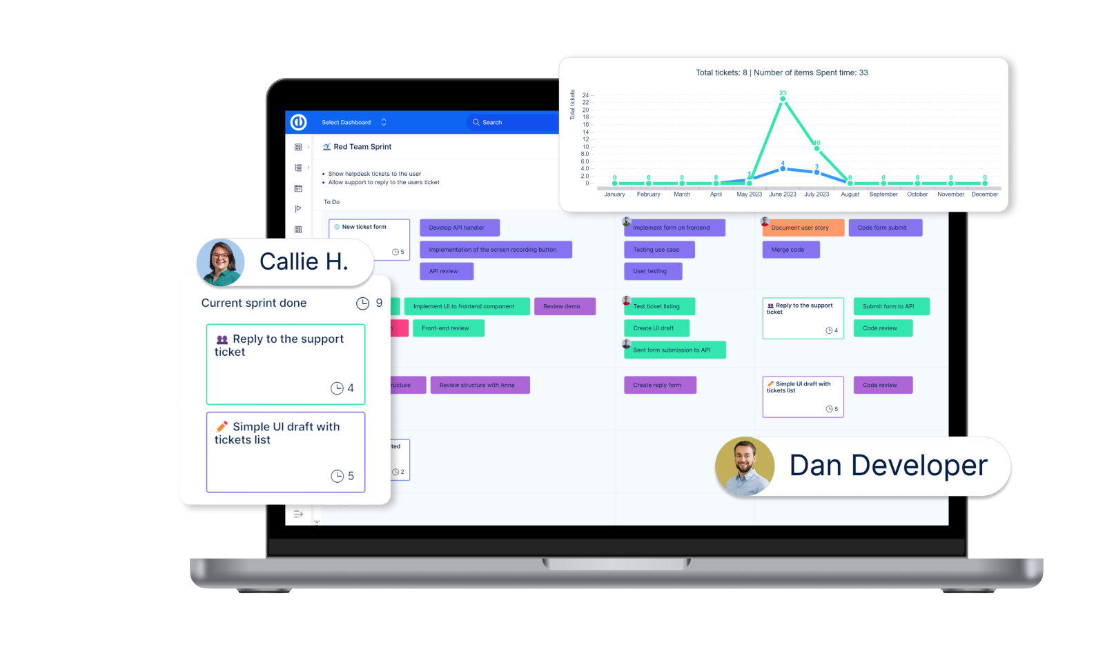 - Connected to Redmine tasks, Agile boards & Gantt