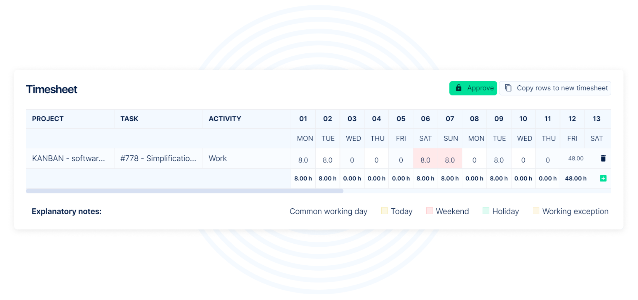 The power of Redmine Timesheet plugin lies in the possibility of batch logging, editing and managing time entries. Do all at once and thus significantly improve project management efficiency!